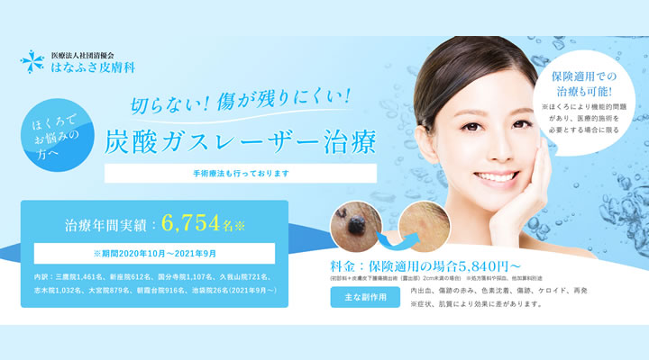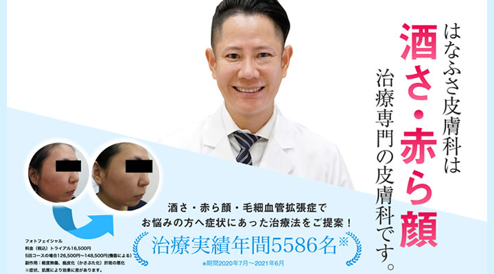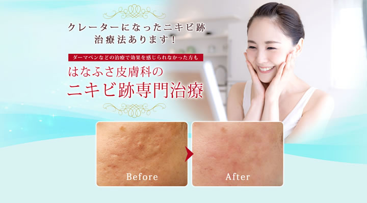 はなふさ皮膚科 形成外科 新宿院では、ニキビ・ニキビ跡の専門的な治療を行っております。ニキビ、ニキビ跡の治療に関して、有効と証明されているものはほぼすべて網羅しており、難治性のニキビ、他院で治らないと言われたニキビ跡の患者様にも多数ご来院いただき高い評価を得ております。
